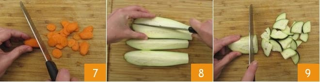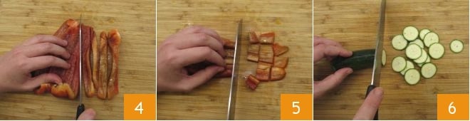 Ahora podéis pasar a la preparación de las verduras: limpiad los pimientos de semillas y filamentos internos, cortadlos en tiras 4 y luego en cuadritos 5. Limpiad los calabacines y cortadlos en rodajas finas 6,