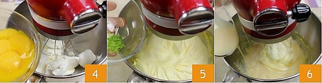 Ahora dedíquense al relleno: coloquen en una batidora con varillas el queso fresco para untar y las 4 yemas 4. Como alternativa, pueden usar un bol grande y una batidora eléctrica o un batidor manual. Monten los ingredientes hasta obtener una mezcla clara y espumosa. Luego, incorporen los otros ingredientes continuando mezclando con las varillas: añadan la ralladura de lima 5 y la leche condensada en hilo fino 6.