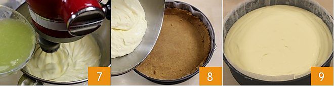 Finalmente, poco a poco, añadan a la mezcla el jugo de lima y mezclen los ingredientes hasta obtener una masa homogénea 7. Ahora su crema está lista. Saquen del frigorífico la base de galleta compactada y viertan la crema en el molde 8. Asegúrense de cubrir uniformemente la base, ayudándose con una espátula para igualar la superficie. Pongan entonces la tarta en el horno y cocinen durante 60 minutos en horno estático precalentado a 170°. Para la cocción en horno ventilado, cocinen la tarta de queso durante 35-40 minutos a 150° 9.
