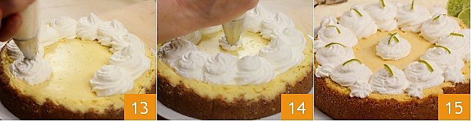 Una vez montada la nata, transfieranla a una manga pastelera con boquilla de estrella. Una vez cocida, saquen su tarta de queso del horno, déjenla templar y desmóldenla en un plato de presentación, luego pónganla en el frigorífico para enfriar durante 3-4 horas. Cuando esté fría, decórenla con copos de nata a su gusto (13-14). Para dar a su tarta de queso de lima un toque aún más escénico, pueden colocar delicadamente sobre cada copo de nata, la ralladura de lima en finas tiras 15!