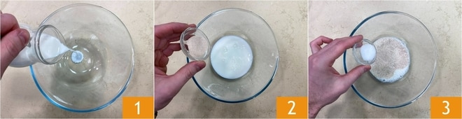Para preparar los khachapuri lo primero que tenéis que hacer es verter en un bol la leche tibia 1 y la levadura deshidratada 2. Añadid el azúcar para activarla 3 y mezclad.