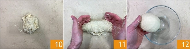 Transferid la masa a una superficie 10 y trabajadla con un poco de harina hasta que esté suave 11. Luego, colocadla en un bol grande 12.