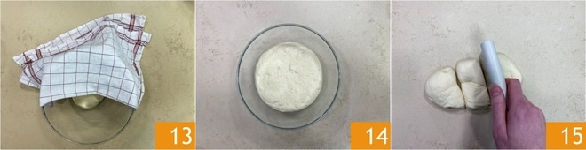 Cubrid y dejad que fermente durante aproximadamente 2 horas en un lugar cálido 13. Cuando la masa haya fermentado bien 14, transferidla a una superficie y divididla en 3 porciones iguales 15.