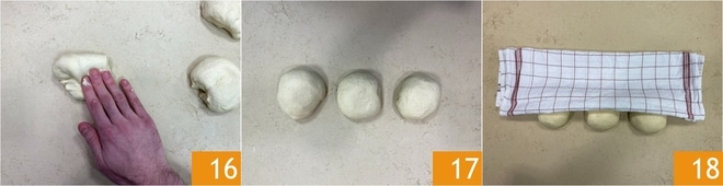 Tomad la primera porción y formad una bolita 16, haced lo mismo con las otras 17 y cubridlas con un paño de cocina 18.