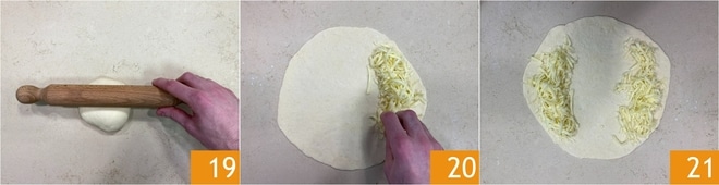 Estirad una de ellas hasta formar un disco 19. Colocad la provola rallada en uno de los dos lados 21 y luego también en el otro 21.