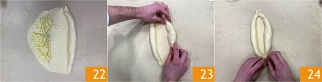 Doblád los bordes enrollando el queso dentro 22 23, luego pellizcad los extremos 24.