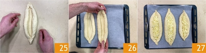 Debéis formar una barca 25. Colocad las barcas en una bandeja con papel de horno 26 y llenad el interior con abundante queso 27.
