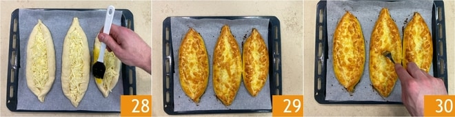Batid juntos la yema y la leche y pincelad los khachapuri con la mezcla obtenida 28. Coced en horno estático precalentado a 190° durante 20-25 minutos. Cuando estén bien dorados, sacadlos del horno 29 y formad un hueco en el centro de la barca, moviendo delicadamente el queso con la ayuda de un tenedor.