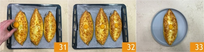 Colocad dentro una yema 31 y coced nuevamente en el horno durante 3 minutos. Sacad del horno 32 y servid vuestros khachapuri aún calientes 33.