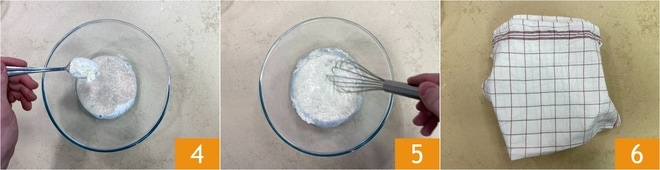 Agregad 2 cucharadas de harina 4 y mezclad con una batidora de mano 5, luego cubrid con un paño de cocina 6. Dejad reposar durante 5 minutos.