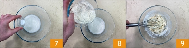 Añadid luego la sal 7 y el resto de la harina 8. Mezclad de nuevo con la batidora 9, hasta obtener una masa homogénea.