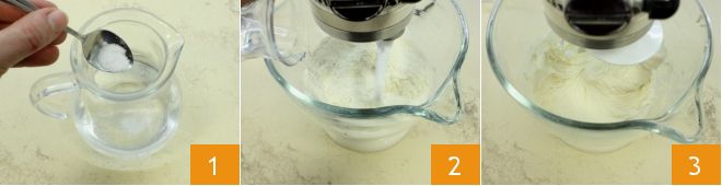 Pasa a preparar la masa de hojaldre (puedes consultar el procedimiento en detalle en la ficha de la Escuela de Cocina: masa de hojaldre): comienza con la preparación del pastón, es decir, la masa principal. Disuelve la sal en el agua 1, luego tamiza la harina manitoba junto con 100 g de harina 00 y colócalas en el bol de una amasadora, añade el agua en la que has disuelto la sal 2 y amasa todo con el gancho a velocidad media durante unos 8 minutos. Debes obtener una mezcla más suave y elástica que la del pan, lisa y homogénea.