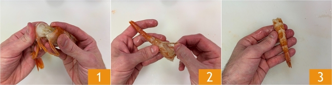 Para preparar los langostinos a la naranja, primero dedicad un momento a la Cómo limpiar los gambones: separad el cuerpo de la cabeza 1, eliminad el caparazón y el hilo interno 2 y dejad la cola unida 3.