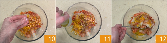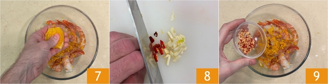 Extraed el zumo exprimiendo la parte central de la naranja en el bol con los langostinos 7. Ahora picad finamente el ajo y la guindilla sin semillas 8 y agregad el picadillo a los langostinos 9.