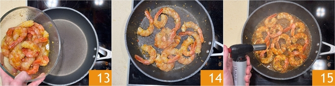 Ahora calentad bien una sartén antiadherente, luego añadid los langostinos con su marinada 16 y doradlos durante 2 minutos a fuego medio-alto 17. Verted el Grand Marnier y flamead con un soplete de cocina para hacer evaporar la parte alcohólica, teniendo cuidado de no quemarse 18. Continuad la cocción un par de minutos más y apagad el fuego.