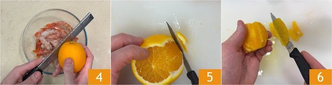 Colocad los langostinos limpios en un bol y condimentad con la ralladura de naranja 4. Con un cuchillo bien afilado pelad la naranja en vivo: primero retirad completamente la cáscara 5, luego extraed los gajos de naranja teniendo cuidado de no tomar la parte blanca 7. Reservad los gajos para la decoración final.
