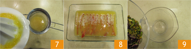 Filtrad los zumos a través de un colador 7 y vertedlos sobre los langostinos 8. Cubrid con film transparente y dejad reposar en la nevera durante al menos 40 minutos. Mientras tanto, preparad el pesto de pistachos. Colocad los pistachos en una picadora 9.