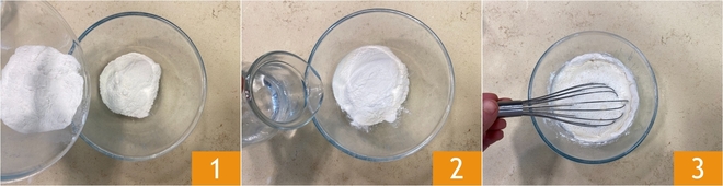 Para preparar los langostinos en tempura, primero prepara la masa: en un bol mezcla la harina de arroz y la harina 00 1, luego añade el agua con gas fría 2 y mezcla bien con una varilla para evitar la formación de grumos 3.