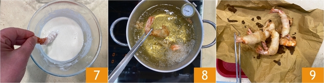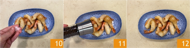 Sazona con sal 10 y pimienta al gusto 11 y sirve inmediatamente tus langostinos en tempura 12!