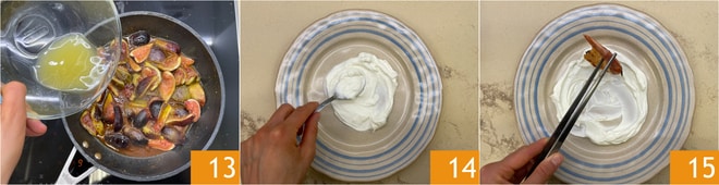 Transfiere los langostinos a un bol, añade unas hojas de menta 10, mezcla y cubre con una tapa, así se mantendrán tiernos. En la misma sartén donde cocinaste los langostinos, derrite la mantequilla 11, luego añade los higos 12. Cocínalos a fuego medio durante 3-4 minutos, hasta que se caramelicen, teniendo cuidado de no romperlos al darles la vuelta. El tiempo de cocción dependerá mucho del grado de maduración de los frutos, cuanto más maduros estén, menos tiempo necesitarán para caramelizarse.