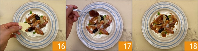Continúa con 4 trozos de higo, algunas hojas de menta, el pan carasau 16 y completa con 1 cucharada del fondo de cocción de los higos 17. ¡Tus langostinos salteados con higos y menta están listos para ser servidos 18!