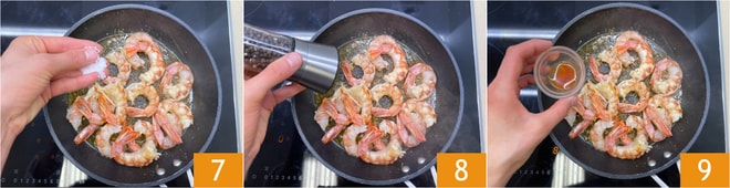 Condimenta con sal 7, pimienta 8 y unas gotas de tabasco 9. Cocina a fuego medio durante 3-4 minutos.