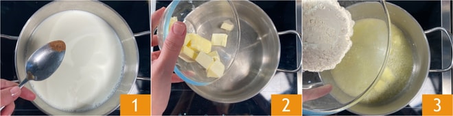 Para preparar las lasañas al ragú de lentejas comienza con la bechamel: vierte la leche en un cazo, añade la nuez moscada 1 y la sal, luego caliéntala. Coloca la mantequilla en otro cazo 2 y déjala derretir a fuego lento, luego añade la harina de una sola vez 3.