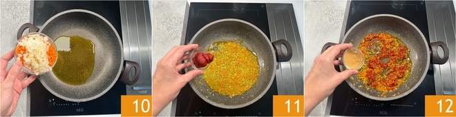 En una olla grande, vierte un chorrito de aceite y el picado para el sofrito 10; deja rehogar durante unos 10 minutos, removiendo a menudo. Luego añade el concentrado de tomate 11 y el jengibre en polvo 12.