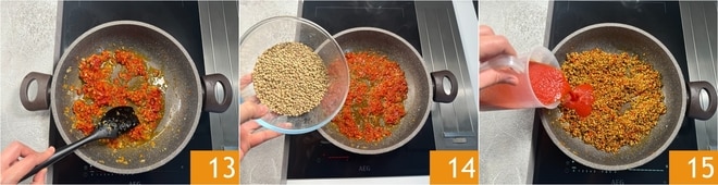 Deja que la base tome sabor brevemente 13 y añade las lentejas 14. Remueve y cubre con la salsa de tomate 15, añadiendo el agua necesaria para cubrir a ras.