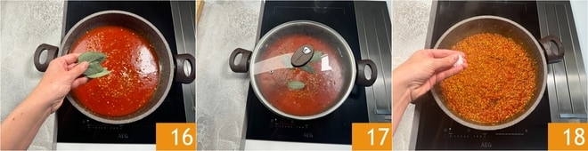 Perfuma con algunas hojas de salvia 16, cubre con la tapa 17 y deja cocinar suavemente por 40 minutos, removiendo de vez en cuando y añadiendo agua si es necesario. Hacia el final de la cocción, ajusta la sal 18 y la pimienta.