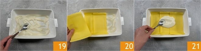 Corta la provola en rodajas muy finas e irregulares y comienza a montar la lasaña. En una bandeja para 4-6 personas, distribuye en la base una capa de bechamel 19, luego procede con una capa de láminas de lasaña (3 láminas, ligeramente superpuestas) 20, continúa con una capa de bechamel 21.