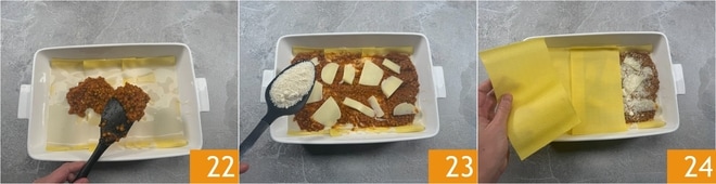 Vierte encima abundante ragú 22, un poco de provola y una pizca de queso grana 23. Continúa con otra capa de láminas 24.
