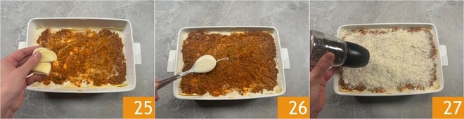 Continúa 25 haciendo un total de 3 capas. En la última capa, distribuye abundante ragú 26, evitando la provola, y abunda en cambio con el Grana Padano rallado 27. Completa con una pizca de pimienta 27