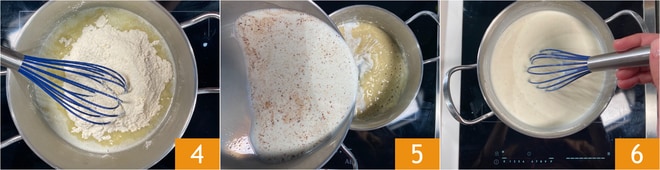 Mezcla con un batidor de mano 4 hasta obtener una mezcla dorada. En este punto, diluye el roux vertiendo primero un poco de leche caliente y luego todo el resto 5. Continúa mezclando a fuego lento hasta que la bechamel se haya espesado 6. Déjala a un lado para que se enfríe.