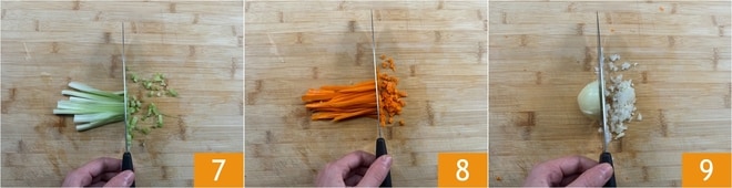Ocúpate del ragú de lentejas: lava, limpia y pica el apio 7, la zanahoria 8 y la cebolla 9 para el sofrito.