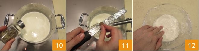 Condimentad vuestra bechamel con una pizca de pimienta 10, sal, una ralladura de nuez moscada 11 y continuad cocinando, siempre mezclando, durante 5-6 minutos, hasta alcanzar la densidad adecuada. En este punto, transferid la bechamel a un bol y cubrid con film en contacto 12.