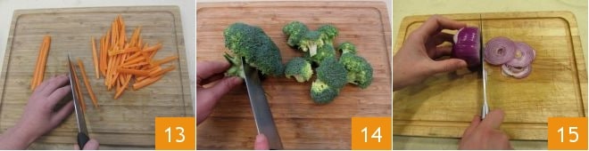 Lavad todas las verduras y comenzad a cortarlas: las zanahorias se pelarán y se cortarán en juliana 13, para los brocolis se recogerán solo los ramilletes 14 y la cebolla se cortará finamente 15.