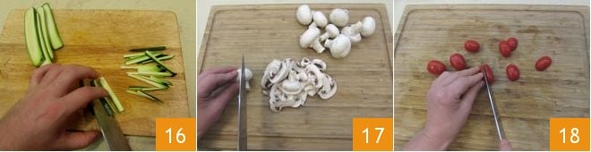 Cortad los extremos de los calabacines y cortad también estos en juliana 16. Limpiad los champiñones, cortadlos en láminas 17 y cortad también los tomatitos por la mitad 18.