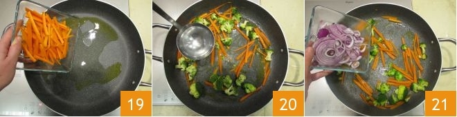 Una vez que tengáis todas las verduras preparadas, verted el aceite en una cacerola y añadid primero las zanahorias 19, dejad cocinar un par de minutos y agregad también los brócolis. Desglasad con un poco de agua 20, cubrid con una tapa y dejad cocinar durante 3-4 minutos. En este punto, añadid también las cebollas 21.