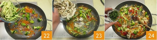 Finalmente, añadid los calabacines 22 y los champiñones 23 y cocinad mezclando de vez en cuando. Una vez cocidos, salpimentad, luego apagad el fuego y agregad los tomatitos y el tomillo 24.
