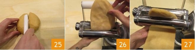 Mientras tanto, vuestra pasta al huevo habrá reposado, así que retomad el bloque y divididlo por la mitad 25. Estirad la pasta con la máquina de rodillos 26, reduciendo el grosor cada vez 27.