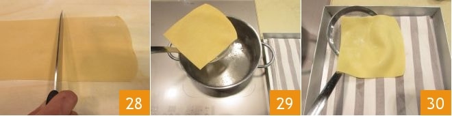 Deberéis obtener láminas de aproximadamente 2 mm de grosor. Cortad las láminas en 8 rectángulos de 15x20 cm 28. Escaldad las láminas durante 1 minuto en agua hirviendo ligeramente salada 29, luego escurrid y colocadlas en una bandeja forrada con un paño de cocina 30. Si preferís, podéis pasar rápidamente las hojas de pasta a un bol con agua fría para detener la cocción, luego extender los rectángulos siempre sobre un paño limpio, pero lo importante será colocar los rectángulos bien extendidos y sin superponerlos.
