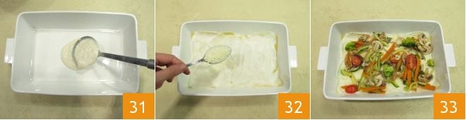 Una vez cocida la pasta, tomad una fuente de horno de 30x20 cm, añadid 2 o 3 cucharadas de bechamel 31 y extendiendo en la base de la bandeja. Colocad 2 rectángulos de pasta, uno al lado del otro, luego cubrid con más bechamel, espolvoread con queso rallado 32 y agregad un tercio de las verduras 33.