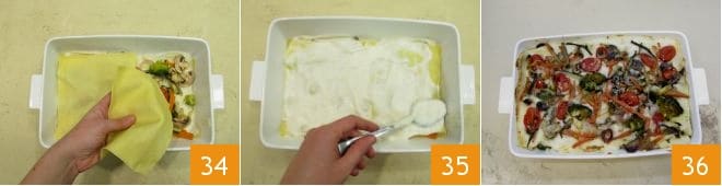 Cubrid con otras 2 hojas de pasta 34 y proceded de esta manera para realizar otros 2 capas, hasta terminar los ingredientes. Al llegar a la última capa de bechamel 35, espolvoread con más queso rallado, cubrid con las verduras restantes y hornead en horno estático precalentado a 180° durante 20 minutos, luego activad el grill y cocinad por 5 minutos más. ¡Vuestras lasañas blancas vegetarianas están listas para servirse 36!
