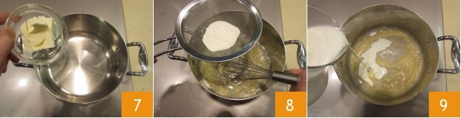 Mientras tanto, ocupáos de preparar la bechamel: verted la mantequilla en un cazo 7, dejad que se derrita suavemente y luego añadid la harina tamizada, mezclando rápidamente 8. Una vez obtenido un roux color avellana, incorporad la leche caliente 9 y mezclad nuevamente.