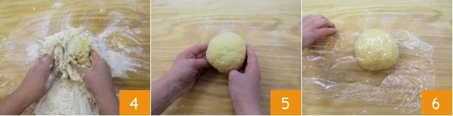 En este punto transferid la mezcla a una superficie para amasar y trabajadla 4, añadiendo la harina reservada según sea necesario, hasta obtener una masa lisa, firme y elástica a la que le daréis una forma esférica 5. Envolvedla en film transparente 6 y dejad reposar durante unos 30-60 minutos fuera del frigorífico en un lugar fresco y seco.