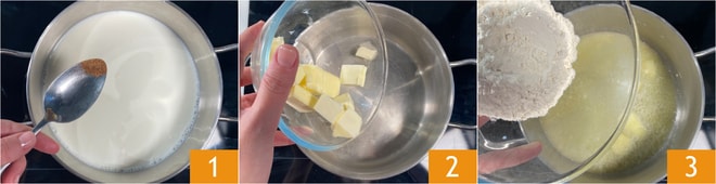Para preparar las lasañas con acelgas, lo primero que se debe hacer es la bechamel: vierte la leche en un cazo, añade la nuez moscada 1 y la sal, luego caliéntalo. Derrite la mantequilla a fuego lento en otro cazo 2. Agrega la harina de una vez 3.