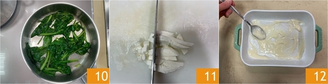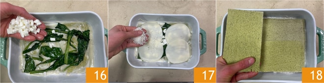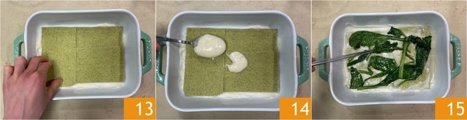 Coloca las láminas de pasta verde 13 y luego otra capa de bechamel 14. Distribuye ahora una parte de las acelgas cocidas 15.