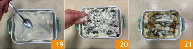 La última capa estará compuesta por bechamel 19, acelgas, mozzarella y quesos rallados 20, pero sin provolone. Cuece en horno estático precalentado a 190° durante 35 minutos. Saca las lasañas con acelgas del horno y déjalas templar antes de servirlas 21.