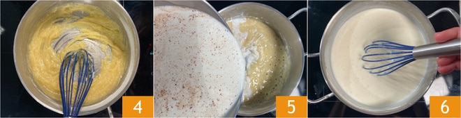 Mezcla vigorosamente con una varilla de mano hasta obtener un compuesto dorado, el roux 4. En este punto, diluye el roux vertiendo primero un poco de leche caliente y luego todo el resto 5. Continúa mezclando a fuego lento hasta que la bechamel se haya espesado 6. Deja enfriar la bechamel.